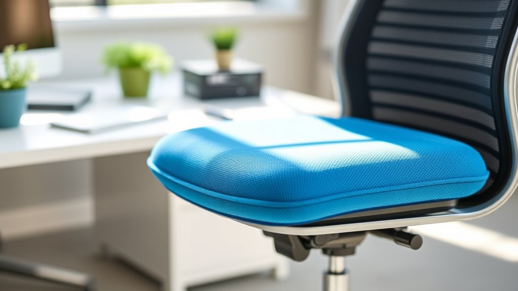 When evaluating swivel seat cushions, safety features should be at the forefront. I look for cushions with anti-slip surfaces and textured materials that prevent slipping during rotation, ensuring stability. Secure grips or straps are vital—they keep the cushion in place and reduce unwanted movement, especially when shifting positions. A non-slip base that firmly anchors the cushion to various surfaces adds an extra layer of safety, minimizing the risk of falls or injuries. I also prioritize cushions that meet safety standards, using non-toxic and durable materials that comply with safety regulations. These features give me confidence that the cushion is designed to keep me safe while making sitting and turning easier. Safety isn’t just an added bonus—it’s essential for peace of mind.