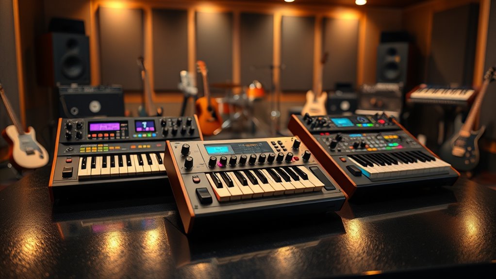 Choosing a synthesizer with great sound quality hinges on understanding how its internal components influence the final tone. The quality of oscillators, filters, and the overall signal path play pivotal roles in shaping sound. High-resolution digital synthesis and analog circuitry can add richness and warmth, making tones more expressive. The variety of waveforms, modulation options, and effects expand sonic possibilities and enhance perceived quality. Polyphony and voice allocation determine how well the synth manages complex, layered sounds without artifacts, ensuring smooth performance. Additionally, built-in effects and processing capabilities influence the final tone’s texture and fidelity. When evaluating options, consider how these elements work together to produce the sound character you desire, whether it’s pristine clarity or warm, organic tones.