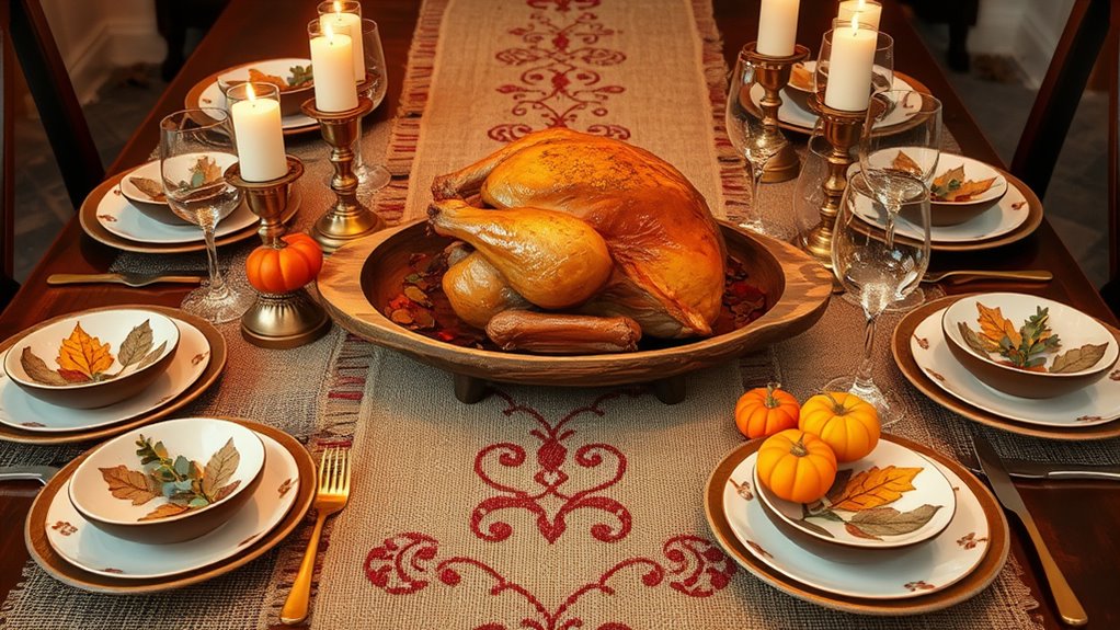 The design and color scheme of your Thanksgiving table runner play a crucial role in setting the tone for your celebration. I recommend choosing a pattern that complements your overall decor style, whether rustic, modern, or traditional. Warm, earthy tones like terracotta, burnt orange, and deep reds are perfect for evoking autumn’s harvest spirit. Incorporating seasonal motifs such as pumpkins, leaves, or turkeys can enhance the festive feel. It’s also important to think about how the runner’s colors interact with your tableware and centerpiece—either contrasting for a bold look or harmonizing for a cohesive aesthetic. Finally, make certain your chosen design and colors coordinate well with other table linens and decorations, creating a unified, inviting holiday table.
