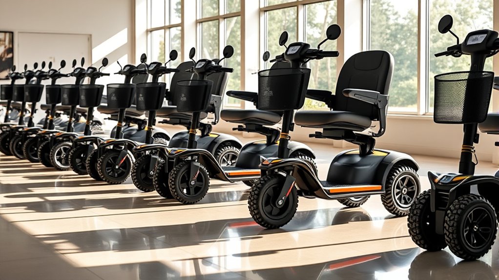 Comfort and seating options play a crucial role in guaranteeing a safe and enjoyable ride on heavy-duty mobility scooters. I look for adjustable, cushioned seats with high-density foam and ergonomic support, especially for longer trips. Features like swivel seats, headrests, and armrests help reduce strain and make transfers easier. Customizable seat height and backrest angles are essential to fit different body sizes and prevent discomfort. Wide, padded seats with supportive cushioning minimize fatigue and keep me stable on uneven terrains. Additional options like lumbar support, safety belts, and breathable upholstery further enhance comfort, making each ride more pleasant. Prioritizing these seating features ensures I stay comfortable and secure, no matter how far I go or how long I ride.