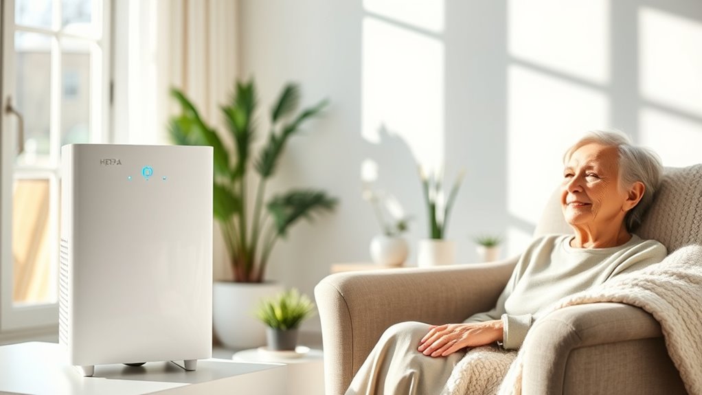 Safety features are essential when selecting a HEPA air purifier for seniors, as they help prevent accidents and guarantee reliable operation. Child locks prevent accidental tampering, which is especially important for seniors with limited dexterity. Automatic shut-off timers ensure the device turns off after a preset time, reducing electrical risks and overuse. Air quality sensors continuously monitor indoor conditions and send alerts, helping seniors respond quickly to poor air quality. Ozone-free filtration technology, like HEPA combined with activated carbon, guarantees no harmful ozone emissions during operation. Additionally, noise reduction features, including ultra-quiet modes operating at 15-20dB, create a peaceful environment, making it easier for seniors to sleep and relax without disturbances. These safety features collectively provide peace of mind and enhance usability.