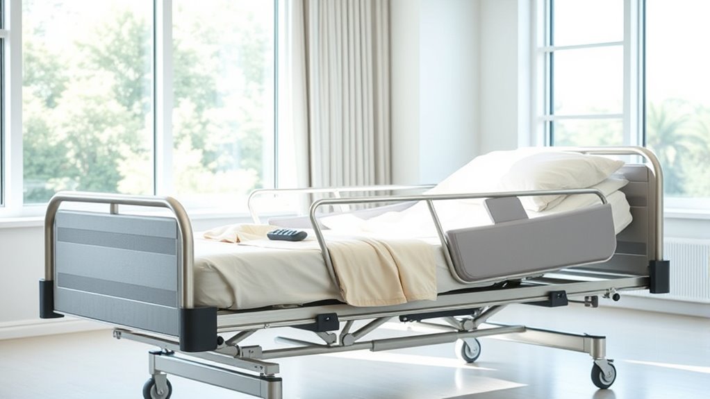 Safety rails and guards are vital features that substantially reduce the risk of falls and injuries in seniors’ hospital beds. They provide secure handholds and barriers during transfers and repositioning, helping seniors stay safe. Half-length or full-length rails are designed to support mobility and stability, minimizing the chance of slipping or rolling out of bed. Properly installed safety guards also enable seniors to reposition themselves independently, boosting confidence and safety. It’s important that safety rails are adjustable or removable to meet individual needs and make caregiver access easier. Regular inspection and maintenance are essential to guarantee these safety features remain secure and functional over time. Choosing beds with reliable, well-designed safety rails can make a significant difference in a senior’s safety and comfort.