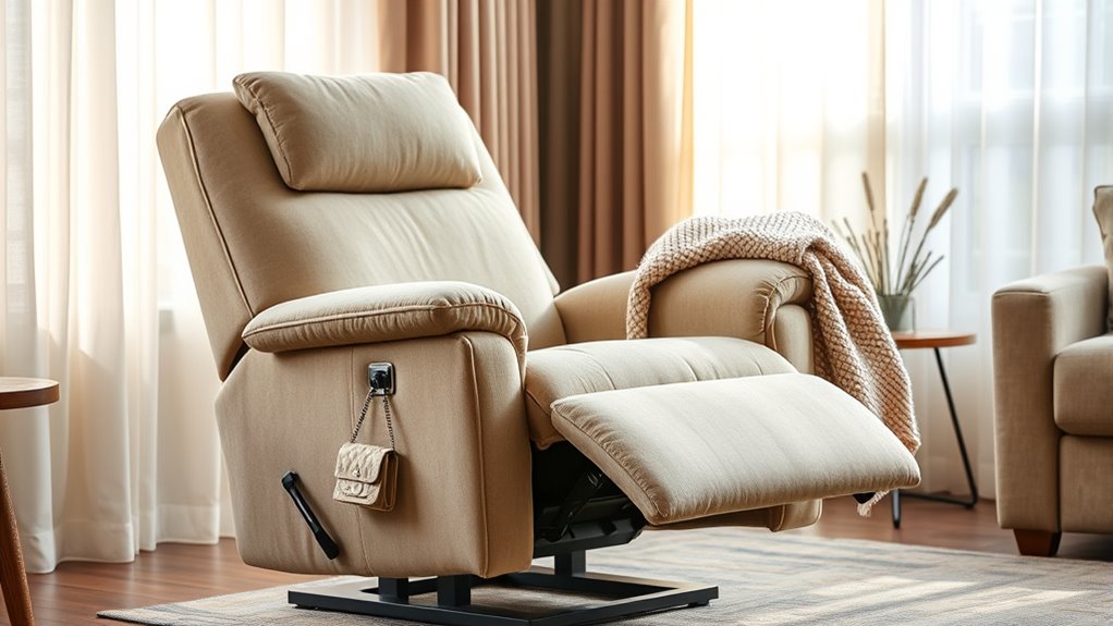 They say safety is no accident, and I agree. Most lift chairs come with built-in safety features like dual safety switches and locking mechanisms to prevent accidental recline. Many also have remote controls with secure settings, so you can avoid unintended movements. I always double-check these features before use to make certain of safety. It’s better to be cautious, because a secure lift chair means a comfortable, worry-free experience.