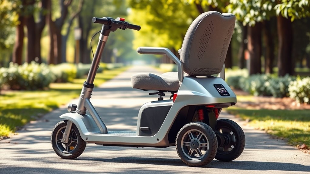 Comfort and seating are essential when selecting a lightweight mobility scooter because they directly influence my ability to ride comfortably for longer periods. A well-designed seat with adjustable height and ample padding helps reduce fatigue and discomfort. Wide, supportive cushions and an ergonomic shape prevent pressure points, making extended rides more bearable. Flip-up or removable armrests make getting on and off easier, adding convenience. A stable, four-point support seat minimizes wobbling on uneven terrain, ensuring safety. Features like shock absorption and cushioned backrests markedly enhance ride smoothness, reducing jolts and vibrations. Overall, choosing a scooter with these comfort-focused elements ensures a more pleasant, less tiring experience, allowing me to enjoy outings without discomfort or worry.