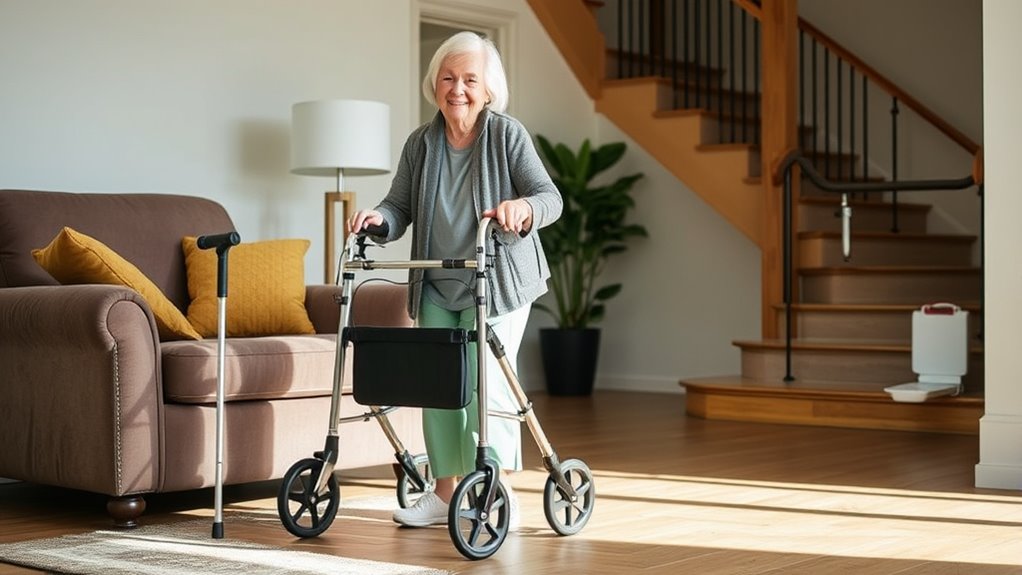 Choosing a mobility aid that’s easy to use can substantially boost confidence and independence for seniors. An intuitive design with minimal adjustments makes daily use simpler and less frustrating. Handles and grips should be ergonomically shaped to reduce hand fatigue and accommodate limited dexterity, ensuring comfort during extended use. Clear, straightforward instructions and quick assembly help users get started without hassle. Lightweight construction is essential, enabling seniors to maneuver and carry the aid effortlessly without extra strain. Accessibility features like simple braking systems and easy height adjustments further enhance usability, making safety and comfort a priority. When selecting a mobility aid, focus on these ease-of-use factors to ensure it truly supports independence and simplifies mobility.