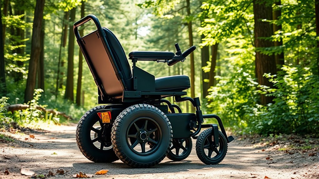 Maneuvering outdoor terrains requires a power wheelchair with excellent maneuverability, making it essential to contemplate factors like turning radius, tire type, and control responsiveness. I look for models with a tight turning radius, ideally under 40 inches, so I can navigate narrow spaces comfortably. All-terrain tires, such as pneumatic or honeycomb types, provide better stability and traction on uneven surfaces, which is vital for outdoor use. Responsive, 360-degree joystick controls allow me to make precise turns and adjustments, especially in complex environments. An adjustable suspension system also helps absorb shocks, ensuring a smoother ride on bumpy terrains. Finally, considering the overall size and weight when folded is important for transporting my wheelchair easily on outdoor adventures. These features collectively enhance maneuverability and make outdoor exploration more accessible.