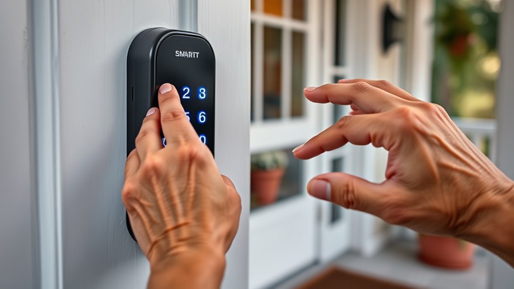 Security features are vital when choosing a smart door lock for seniors, as they directly impact safety and peace of mind. I look for locks with multiple secure unlocking options, like fingerprint recognition, keypad PINs, and backup keys, to guarantee versatile access. Anti-peeping password protection and tamper alarms are essential to prevent unauthorized entry and alert me to potential breaches. I prioritize models with encrypted wireless communication and fail-safe mechanisms, which protect against hacking and signal interference. Auto-lock and lockout features after failed attempts add an extra layer of security. Lastly, real-time access logs and remote monitoring capabilities give me peace of mind, allowing me to track entry activity and respond swiftly if needed. These features collectively assure maximum safety and ease for seniors.