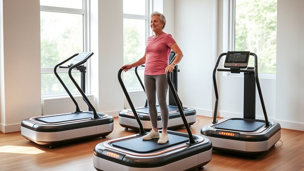 Yes, there are specific models perfect for seniors with limited mobility. Imagine a gentle breeze guiding you, just like these machines do—offering support without overwhelming. I recommend looking into compact, easy-to-use vibration platforms with low-intensity settings, such as the HealthGear Vibration Plate or the FitVibe Mini. These devices prioritize safety and comfort, helping you regain strength and confidence without the risk of strain or injury.