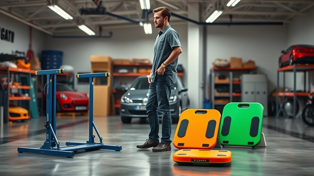 When selecting transfer devices for car transfers, I focus on compatibility with different vehicle types to guarantee a smooth fit. I also consider weight capacity limits and ease of use, so the device is both safe and convenient. Additionally, I look at material durability and safety features to assure long-lasting performance and user protection.