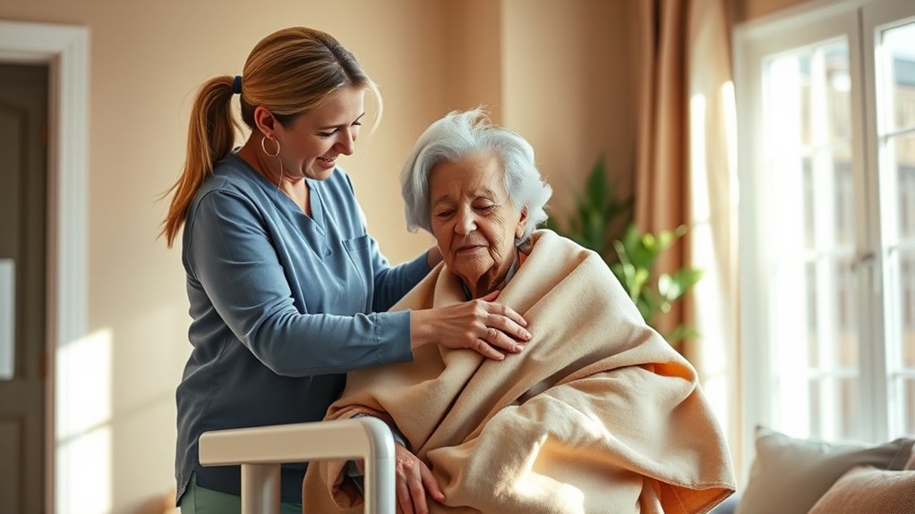 Portability and storage are vital factors to contemplate in a transfer lift, especially if you’re working with limited space. When choosing a lift, I recommend considering its weight and size to guarantee you can easily move and store it. Foldable or collapsible designs can considerably reduce bulk, making it easier to tuck away when not in use. Look for models made from lightweight materials like aluminum or reinforced plastic to enhance portability without sacrificing strength. Smooth-rolling, lockable wheels are essential for maneuverability and stability during transfers. Finally, make sure the lift can fit through standard doorways and narrow hallways, allowing for seamless movement throughout your home or facility. These considerations will make your caregiving experience much smoother.