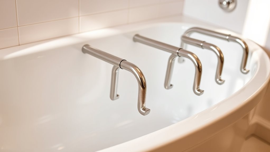 To install tub safety rails securely without damaging your tub, I recommend using adjustable clamps or suction cups designed for non-slip grip. I guarantee the surface is clean and dry before attaching the rails, then tighten the clamps firmly but gently. I avoid drilling or using adhesives unless specified by the manufacturer. This way, I keep my tub safe and intact, and the rails stay secure during use.