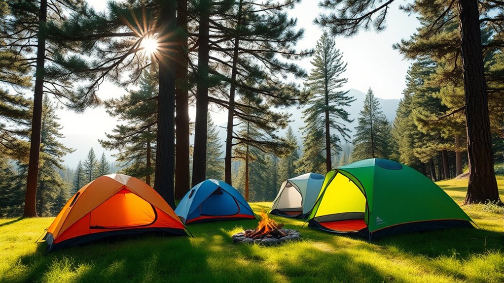 After ensuring my tent can withstand the elements, I focus on size and capacity. I choose a tent that comfortably fits my body and gear, leaving enough room for movement or storage. For solo camping, I usually go for a 1-2 person tent; it provides enough space without adding unnecessary weight. If I’m camping with friends or family, though, I consider larger capacities, like 3-4 person tents, which offer more room but can be bulkier. I pay close attention to the interior dimensions and peak height to make certain I have enough headroom. Ultimately, I select a capacity that matches my needs, balancing comfort with portability to avoid under- or over-packing.