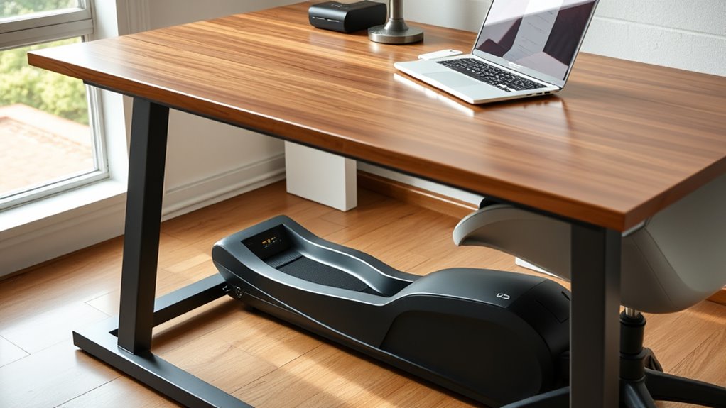 If you’re looking for an easy way to stay active at your desk, I recommend checking out the 13 best under-desk ellipticals, which offer quiet operation, adjustable speeds, and space-saving designs. They’re perfect for low-impact exercise, whether you’re working or relaxing. Many models include remote controls, multiple modes, and display metrics to keep you motivated. Keep going if you want to discover which options fit your needs and how they can enhance your daily routine.
