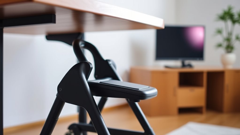 Making certain that your under-desk walker’s motor duty cycle matches your usage habits is crucial for its longevity and performance. I recommend checking whether the motor is rated for continuous use or intermittent operation to match your daily activity level. If you plan to work for several hours straight, choose a model capable of prolonged sessions without overheating or performance issues. Also, consider your environment—hot or poorly ventilated spaces require a motor with robust thermal management features. For heavier workloads, select a walker with a higher duty cycle rating to prevent overheating and ensure safety. Matching the motor’s duty cycle to your environment and workload guarantees that your device remains reliable, durable, and safe for all-day use.