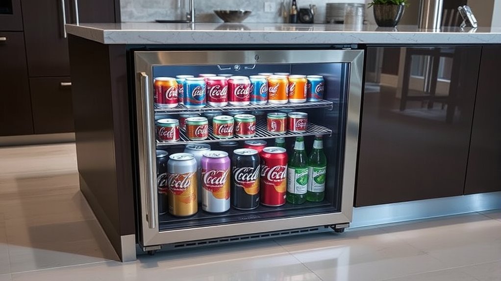 Choosing the right size and capacity for your under-counter beverage cooler is essential to guarantee it fits well and meets your storage needs. Start by measuring your available space carefully, including height, width, and depth, to ensure the unit fits comfortably without obstructing access or ventilation. Next, consider how many cans or bottles you want to store; options typically range from about 127 to over 180 units. Think about internal shelving as well—adjustable or removable shelves give you flexibility to organize different beverage sizes. It’s also important to balance capacity with energy efficiency, since larger coolers tend to consume more power. Lastly, verify that the cooler’s dimensions and ventilation requirements align with your setup, ensuring smooth installation and optimal performance.