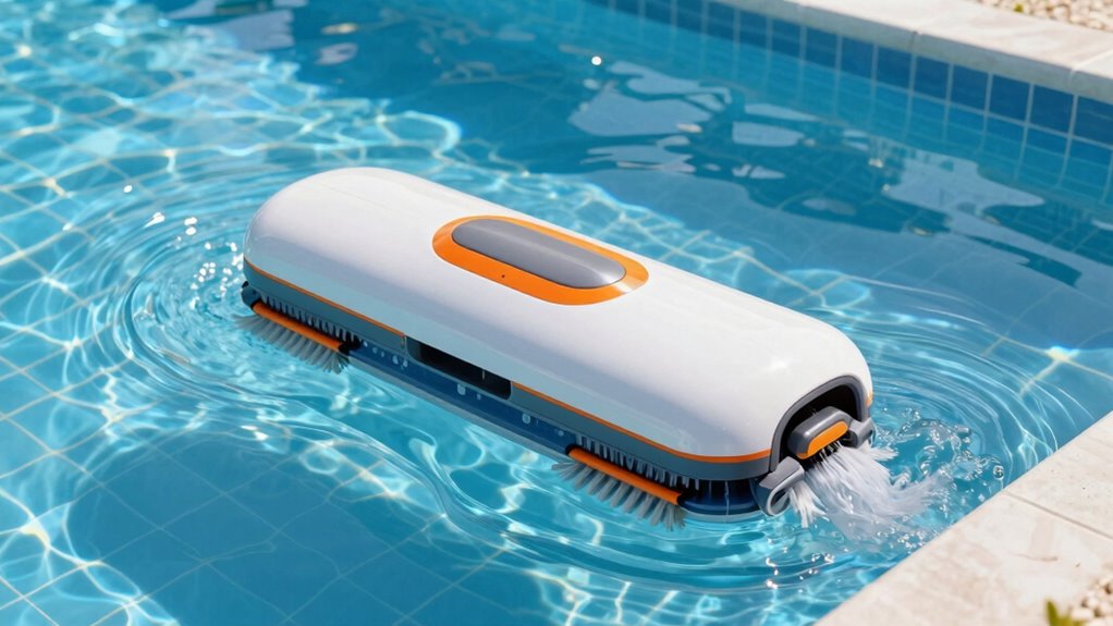 Robotic pool cleaners handle uneven or rocky bottoms pretty well because they’re designed with flexible, adaptive brushes and smart navigation systems. I’ve found that models with multi-directional wheels and adjustable brushes can maneuver over rough terrain and climb small inclines. They sense obstacles and adjust their path accordingly, ensuring thorough cleaning even in challenging pools. So, if you’ve got a rocky bottom, look for a model with good terrain adaptability.