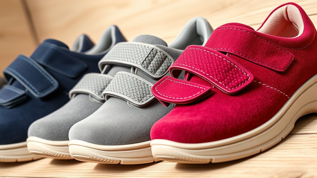 Finding the right Velcro shoes for seniors means prioritizing support and comfort. Adjustable closures let you customize the fit easily, reducing pressure points and preventing discomfort. Look for shoes with proper arch support and cushioned insoles, which help ease foot pain and boost stability. Wide toe boxes are essential for accommodating swollen or wider feet, preventing crowding and soreness during long wear. Non-slip outsoles with good traction provide a secure footing, minimizing fall risk. Breathable materials and moisture-wicking linings keep feet dry and comfortable, reducing irritation and skin issues common among seniors. Ultimately, shoes that combine these features ensure you stay comfortable and supported throughout the day, making walking and daily activities safer and more enjoyable.