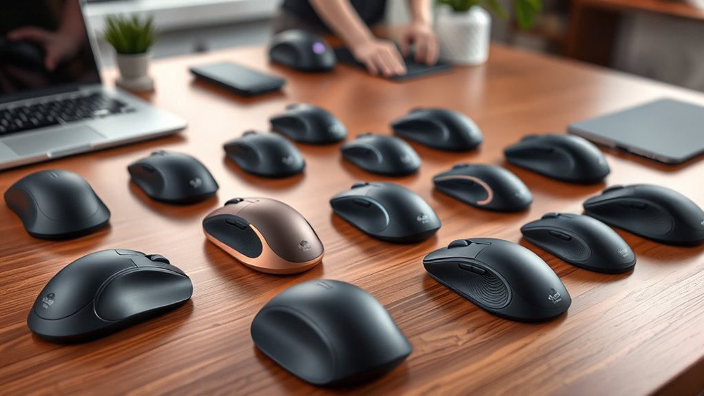 Choosing a vertical mouse that fits your device setup is key to ensuring comfortable, pain-free use. First, make sure it’s compatible with your operating system, whether Windows, macOS, Linux, or Android, so everything runs smoothly. Check if it supports multiple connection methods like Bluetooth, a 2.4GHz USB receiver, or USB-C, giving you versatile pairing options. Confirm that the mouse matches your device’s port type—USB-A, USB-C, or Bluetooth—to avoid connection issues. Also, review the product specs for multi-device support, which allows easy switching between computers, tablets, or smartphones. Ensuring these compatibility factors are met helps you avoid frustrating setup problems and guarantees a seamless experience tailored to your device ecosystem.