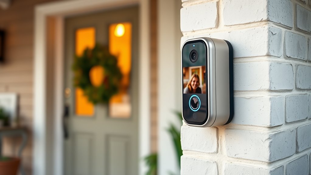 Yes, many video doorbells offer loud alerts or flashing lights suitable for hearing-impaired seniors. I’ve seen models that include adjustable volume, visual notifications like flashing lights, or even compatible with vibrating alerts through connected devices. These features guarantee seniors can stay aware of visitors without relying solely on sound, giving peace of mind and enhancing safety for those with hearing difficulties.