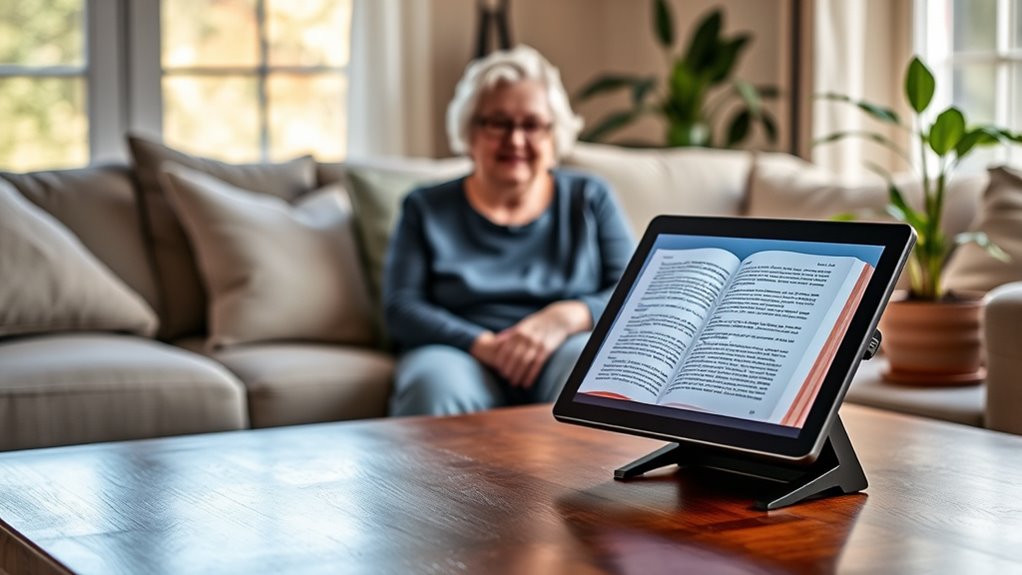 Selecting the right display size for a video magnifier can considerably enhance your reading experience. You’ll find options ranging from compact 3.5 inches to larger screens of 12 inches or more. A larger display offers you more viewing area, making it easier to read and view images without constantly adjusting the device. If you’re looking for portability, though, smaller screens are lightweight and perfect for quick tasks on the go, but they may require you to hold them closer for clarity. Remember, the best size for you depends on your specific visual impairment, reading habits, and comfort preferences. Take the time to assess what works best for your needs; it can make all the difference in your daily activities.