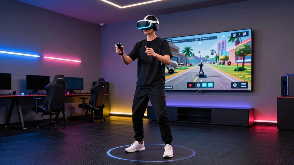 Think of safety features in standing VR gameplay as your personal guardian angels. Essential ones include boundary systems that map your space, alerting you when you’re close to obstacles. Quick-reset options prevent falls, and ergonomic straps keep headsets secure. I always guarantee these are in place, because they act like a safety net, allowing me to play confidently without fear, fully immersed in the experience.
