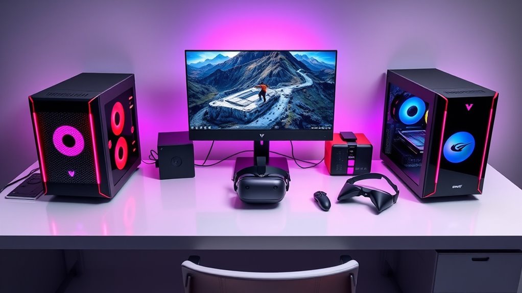 If you’re looking for the best VR-ready desk PCs for 2025, I suggest you consider models with high-performance CPUs like Intel Core i7-14700F or i9-14900KF and powerful GPUs such as RTX 5060 Ti or RTX 5080. Fast RAM, ample storage, and solid cooling are key for smooth VR. Remember, the right system balances power and compatibility to make an immersive experience. Keep going to discover the top options and what makes them stand out.