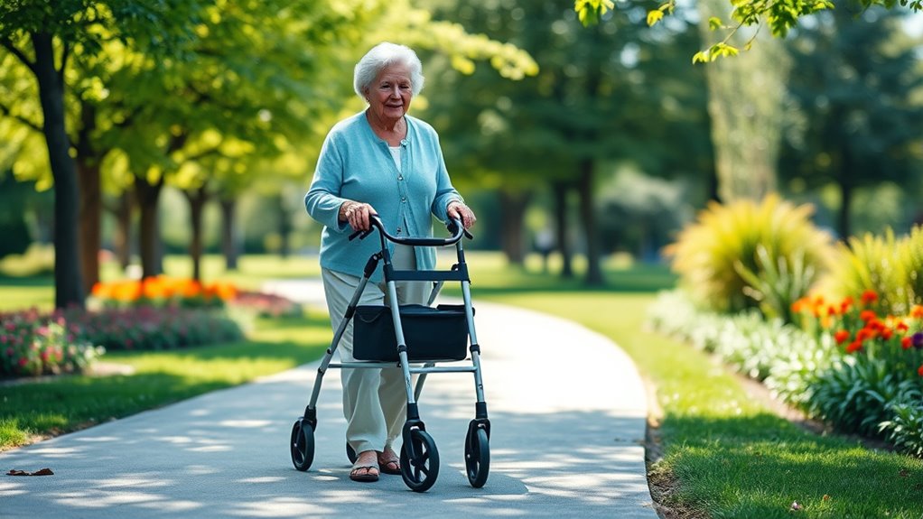 Ensuring stability and balance is essential when selecting a walker for elderly seniors, as these features directly impact safety and confidence during use. A wide base and low center of gravity help prevent tipping, providing greater security. Four-point contact with the ground, like four legs or wheels, enhances balance and minimizes wobbling. Non-slip rubber tips and wheels improve grip on various surfaces, guaranteeing steadiness with each step. Adjustable height settings are critical; they guarantee proper posture, which promotes better balance and reduces strain. Features like independent side operation can further improve stability by allowing users to support themselves more securely when standing or moving. Prioritizing these stability factors helps seniors stay active, safe, and confident while using their walkers.