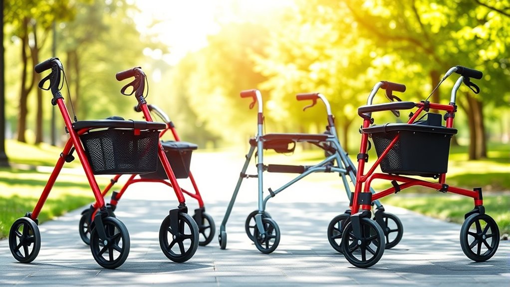 Choosing a walker with excellent stability and balance is vital for safety and confidence. I look for models with a wide base and a low center of gravity to prevent tipping. Four-point contact, like four wheels or legs, helps maintain steady support and reduces fall risk. Adjustable height features are indispensable so I can set the walker to my proper posture, enhancing stability. Non-slip rubber tips or feet on each leg ensure a firm grip on different surfaces, boosting safety. Extra stability features, such as anti-tip bars or wide front casters, are especially helpful on uneven terrain. These elements collectively provide a secure foundation, making it easier to move confidently and minimizing the chance of accidents. Prioritizing stability and balance is key to choosing the best walker for seniors.
