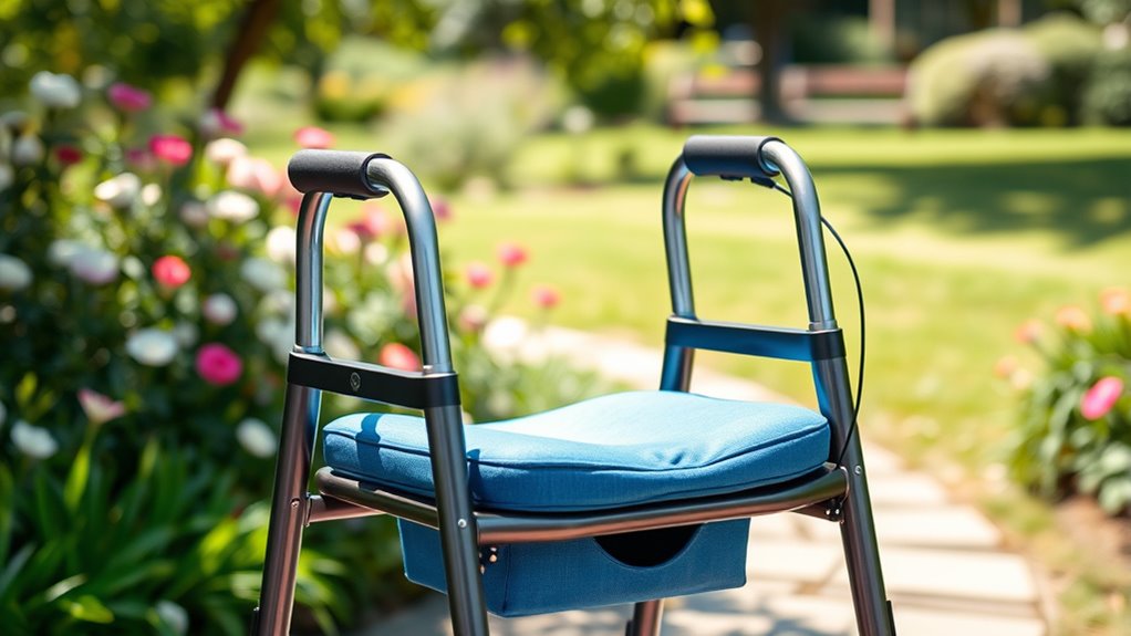 Have you ever sat on a walker seat that felt hard or uncomfortable? I know how important comfort is for seniors who rely on these devices daily. A good seat should have ample padding, like memory foam or foam cushioning, to ease pressure during longer sits. Breathable fabrics or mesh backrests help prevent overheating, keeping you cool and comfortable. The seat width matters too; around 18 inches or more ensures plenty of space for different body sizes. Ergonomic design features, such as rounded edges and supportive contours, reduce pressure points and boost comfort. Finally, adjustable seat height lets you customize the position for easier sitting and standing, making each use more comfortable and less tiring. Comfort truly makes a difference in daily mobility.