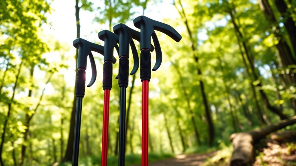 Did you know that aluminum walking poles are about 30% lighter than traditional steel ones? When choosing materials, I recommend aluminum for a great balance of durability and lightweight design. If you need even lighter options, carbon fiber is superb, offering excellent strength without the weight. Both materials hold up well over time, making your walks more comfortable and stable without adding unnecessary bulk.