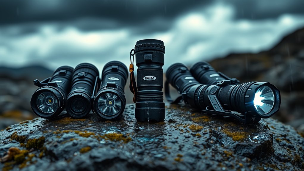 When selecting a waterproof flashlight for storm emergencies, I consider several key factors to guarantee reliability. Understanding waterproof level standards, brightness, battery life, durability, and portability helps me choose the best option. Let’s explore these points so you can pick a flashlight that truly meets your needs.