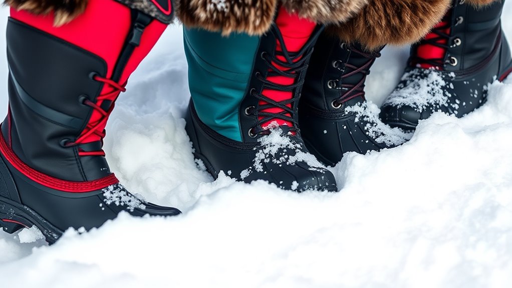 To stay warm during harsh winter conditions, selecting snow boots with effective insulation is essential. Materials like faux fur, Thinsulate, or Thermolite provide excellent warmth by trapping heat and preventing cold air from reaching your feet. The thickness and type of insulation directly influence how well your boots retain heat and keep out the chill. Properly insulated waterproof boots can keep your feet warm even in temperatures as low as -25°F (-32°C). It’s also important that insulation is evenly distributed throughout the boot, ensuring consistent warmth and comfort. High-quality insulation materials help prevent frostbite and cold-related discomfort during prolonged exposure to winter weather. Ultimately, good insulation is key to enjoying winter activities without suffering from cold feet.