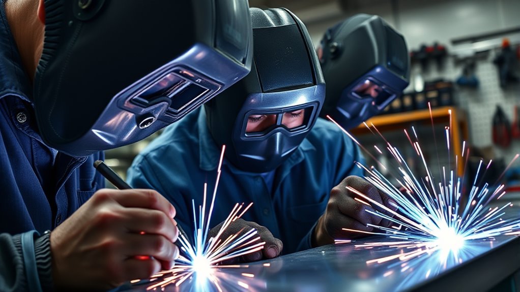 To keep my welders ideal for aluminum, I regularly clean the contact tips and nozzles to prevent buildup, which guarantees smooth operation. I also check and replace worn parts, like the liners and cables, to maintain consistent arcs. Additionally, I keep the machine’s cooling system clean and well-maintained, and I always follow the manufacturer’s recommended maintenance schedule. Proper storage and using the right shielding gas also help prolong my welder’s life.