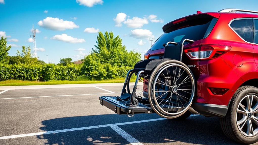After confirming the load capacity of your wheelchair carrier, it’s important to contemplate hitch compatibility. You’ll want to verify that your carrier matches your vehicle’s hitch class—whether it’s Class II, III, or IV—as each is designed for specific hitch sizes and weight ratings. Most commonly, hitch receiver sizes are either 2 inches or 1.25 inches, and knowing this helps in selecting the right carrier. Some carriers may also require a hitch adapter or riser to fit properly or to optimize height for loading. Remember, the hitch’s weight capacity must meet or exceed the weight of your wheelchair to ensure safe transport. In conclusion, consider the hitch type, as it affects installation ease and overall stability.