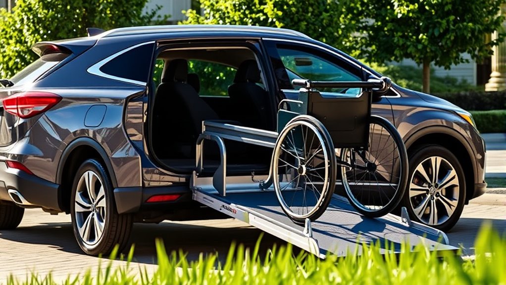 Choosing the right wheelchair lift for my car also hinges on portability and storage. A lightweight, foldable design really makes a difference, allowing me to easily transport and store it in my trunk or closet. When it’s folded, its compact dimensions guarantee it takes up minimal space, which is great for tight areas. I appreciate that many portable lifts come with carry handles or wheels, making them effortless to move when needed. The foldable components mean I can quickly assemble or disassemble the lift, enhancing its convenience for on-the-go use or emergencies. Overall, considering portability and storage options helps me keep my space organized and ready for whenever I need the lift.