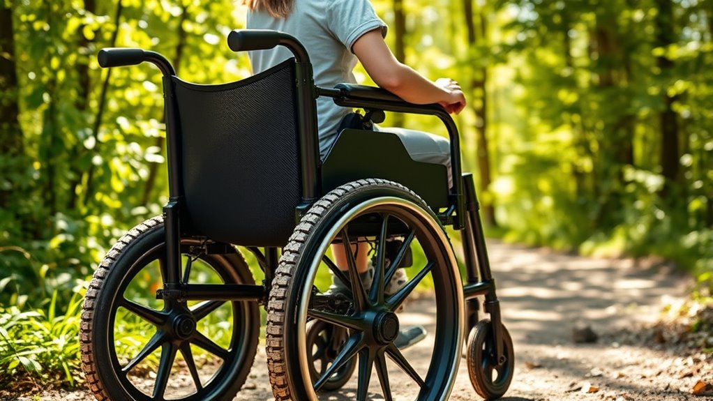 When traversing outdoor terrain, comfort features can make all the difference in your experience. Look for wheelchairs with adjustable, padded armrests that support your arms comfortably during long rides. Cushioned seats and backrests help reduce pressure points, especially on uneven surfaces. Ergonomic back support keeps you in proper posture, preventing discomfort over extended periods. Lightweight yet sturdy frames are essential for easier maneuverability across varied terrains without sacrificing durability. Breathable upholstery is also important, as it prevents overheating during prolonged outdoor activity. These features work together to enhance your comfort, allowing you to enjoy outdoor adventures with less fatigue and more confidence. Prioritizing these comfort elements ensures your wheelchair supports you well on all outdoor journeys.