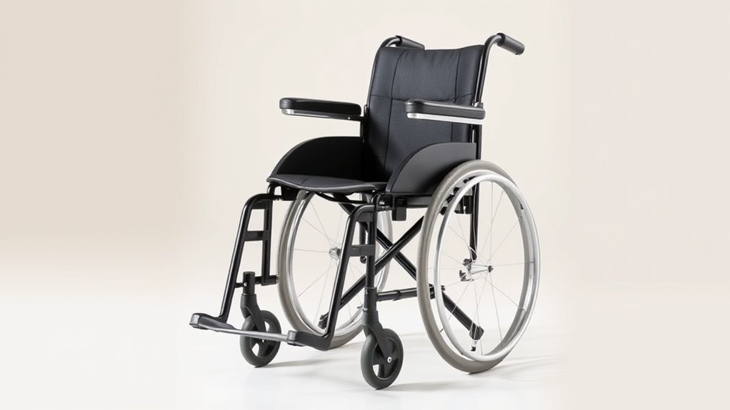 Adjustable armrests and legrests are essential features that guarantee a personalized and comfortable fit for petite adults. They allow you to tailor the wheelchair to your shorter limbs and torso, promoting better posture and preventing discomfort during extended use. Features like flip-back or removable armrests make transfers easier and improve accessibility, which is especially helpful for limited mobility. Elevating or swing-away legrests accommodate different leg lengths, making it simpler to get in and out of the chair. Properly adjustable components also help prevent strain on your joints and muscles, offering better ergonomic support. When choosing a wheelchair, verify these features are easy to adjust and secure, so you can customize your fit for maximum comfort and support every time you sit down.
