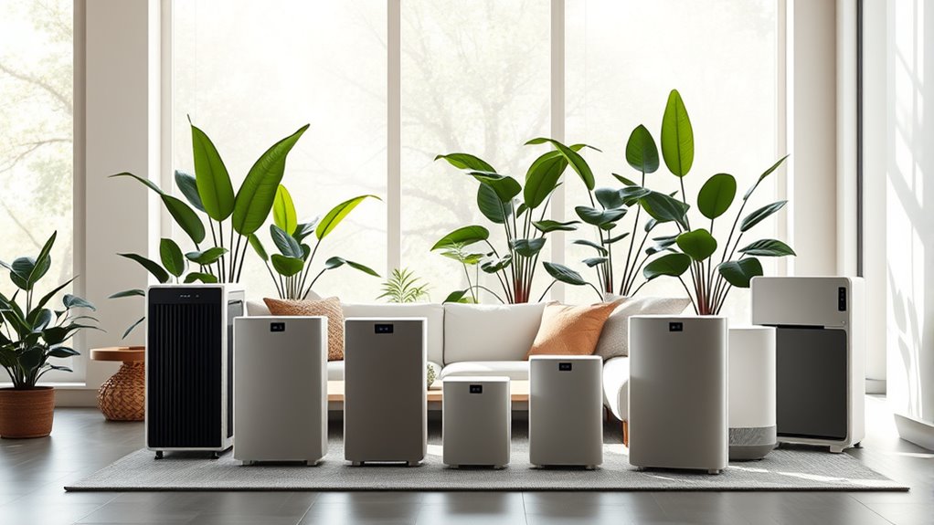 While evaluating whole-house air purifiers for allergies, I can’t stress enough the importance of noise levels. If you’re planning to use one in a bedroom or a quiet living space, you’ll want a unit that operates between 20-30dB to ensure minimal disturbance. Many high-quality purifiers have sleep modes that can reduce noise to as low as 15dB, creating a peaceful environment for rest or work. For reference, normal conversation is around 60dB, so you’ll want to avoid purifiers that exceed 50dB, especially in noise-sensitive areas. Choosing a model with adjustable fan speeds lets you balance noise output with air cleaning performance, tailoring it to your comfort needs. After all, a clean air environment shouldn’t come at the cost of peace and quiet.