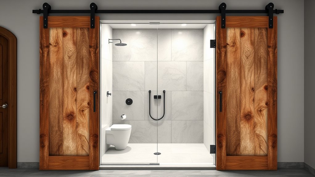While wide-opening barn-style doors might seem overwhelming in small bathrooms, I find they can actually make the space feel more open if chosen carefully. Their large glass panels create an illusion of extra room, especially when paired with light colors and minimal decor. Just guarantee the door isn’t bulky or heavy, and consider sliding options to maximize space. With the right design, they enhance small bathrooms beautifully.