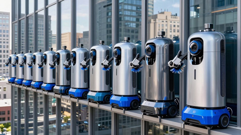 Window cleaning robots tackle high or tricky windows by using extendable arms, powerful suction, and advanced sensors to navigate safely. I’ve found they adjust to different heights and angles, even reaching difficult spots on skyscrapers or awkward panes. They’re designed with safety features and sturdy grips, so I don’t worry about falls or mishaps. Overall, these robots make cleaning those hard-to-access windows much easier and more efficient.