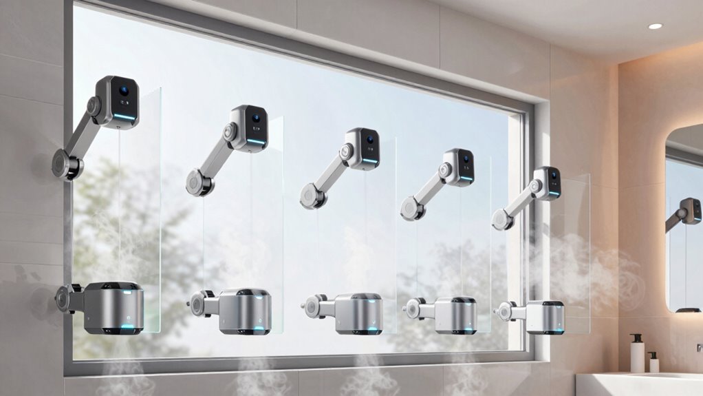 In 2026, I recommend five top window robots designed for humid bathrooms. These models feature waterproof seals, corrosion-resistant materials, and powerful suction to handle moisture and obstacles. They come with app control, ultrasonic spray nozzles, and advanced sensors for safety and efficiency. Whether it’s the Smart Window Cleaning Robot or the M84 with spray functions, these robots are built to perform reliably in damp environments. Keep exploring to find out which one suits your needs best.