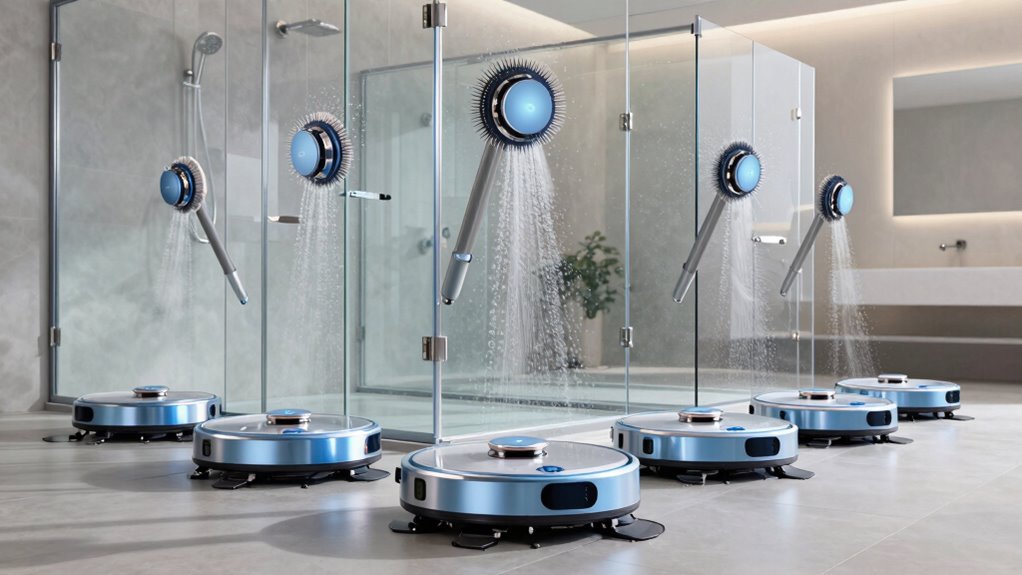 Shower glass cleaning robots tackle soap scum and hard water stains using specialized brushes, scrubbing pads, or ultrasonic technology. I’ve found they’re quite effective when paired with targeted cleaning solutions that loosen stubborn buildup. The robots automatically navigate your shower, applying the right amount of pressure and scrubbing thoroughly. Regular use keeps my glass crystal clear, and I don’t have to spend hours scrubbing myself anymore.
