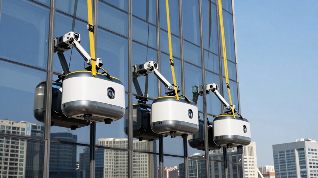 Ensuring safety and compliance starts with selecting the right window cleaning robot tethers, which must meet specific regulatory standards. These standards include adherence to local regulations like OSHA in the U.S. or CE marking in Europe, ensuring that the tethers are legally certified for safety. The tethers should have a minimum breaking strength that exceeds the robot’s maximum weight, preventing accidental falls if the tether fails. Proper anchoring hardware, tested and certified for safety, is essential for secure attachment during operation. Additionally, the materials used must resist weather, UV rays, and corrosion to maintain their integrity over time. Regular inspection and maintenance are critical to meet safety standards and prevent failure, ensuring consistent, safe operation of the cleaning robot.