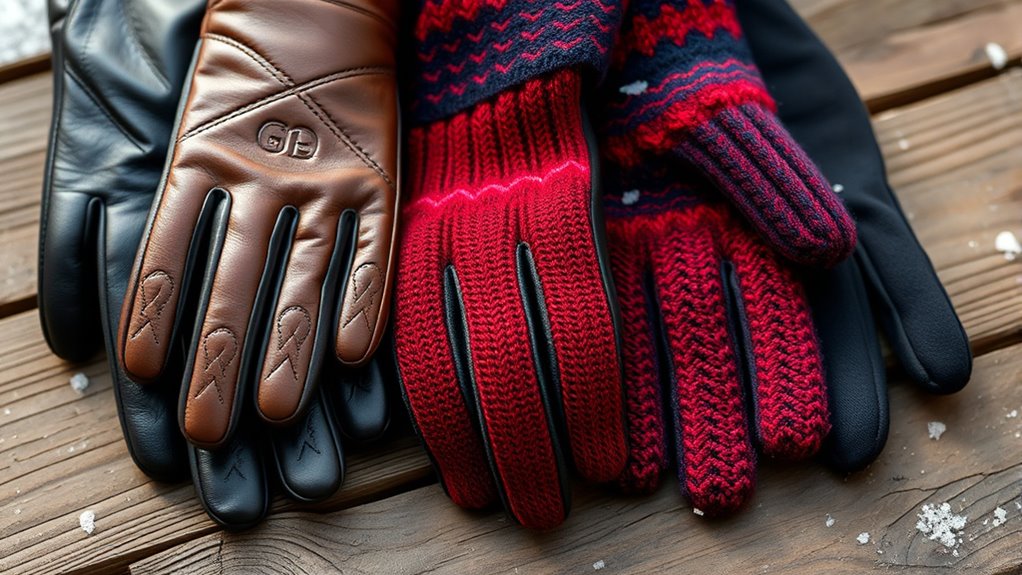 To care for your winter gloves, I recommend checking the label first. I usually hand wash them in cold water with mild detergent, avoiding bleach. If they’re waterproof, I let them air dry, avoiding direct heat. For leather gloves, I use a damp cloth to clean and apply leather conditioner occasionally. Regular maintenance keeps them looking good and guarantees they stay warm and functional throughout the season.
