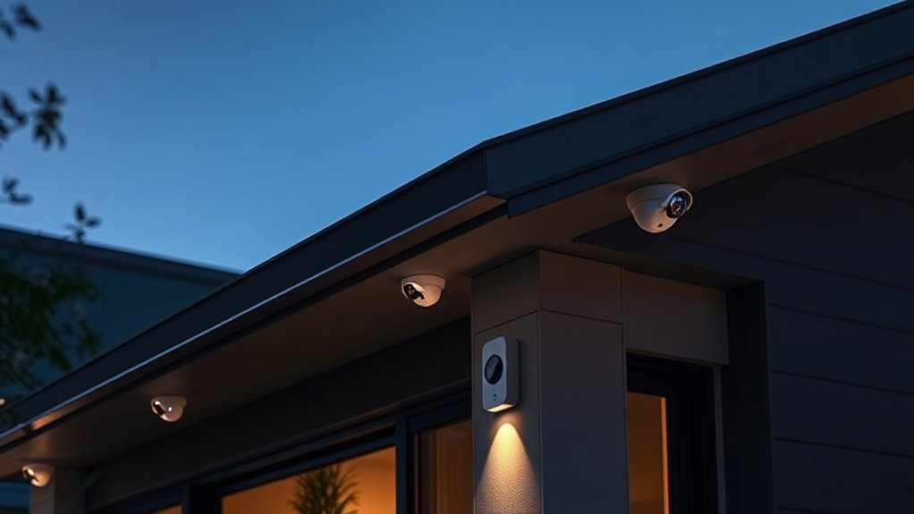 Weather can impact my solar-powered security cameras considerably. Strong rain or snow can block sunlight, reducing their ability to recharge efficiently. Cloudy days also limit sunlight exposure, which may cause cameras to operate on stored energy, potentially affecting their performance. Extreme temperatures, whether hot or cold, can strain batteries and electronics. To keep them running smoothly, I make sure they’re positioned to maximize sunlight and consider weather-resistant models.