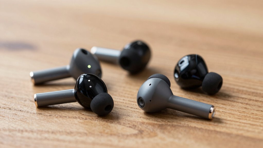 Responsive touch controls or physical buttons are essential for managing your earbuds effortlessly, allowing you to adjust volume, skip tracks, or answer calls without reaching for your device. When choosing budget-friendly earbuds, look for models that support multiple functions like play/pause, call answering, and voice commands to maximize usability. Features such as voice assistant activation can boost hands-free convenience, making it easier to control your device on the go. Customizable controls or app support are a bonus, letting you tailor settings to your preferences. Additionally, consider earbuds with ambient sound modes or noise cancellation, which can improve listening flexibility in different environments. Prioritizing these control features guarantees a seamless, user-friendly experience without sacrificing convenience or functionality.
