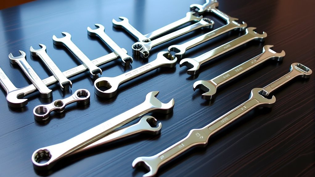 Selecting durable wrenches hinges on their material quality and construction. High-quality chrome vanadium steel is my top choice because it delivers exceptional strength, durability, and resistance to wear and deformation. A corrosion-resistant chrome or mirror finish is essential to guard against rust, especially in tough environments, prolonging the tool’s lifespan. Forged construction boosts the structural integrity, allowing the wrenches to handle high torque without breaking. I also look for wrenches with a high hardness rating, like HRC 50, which maintain their shape and performance under heavy-duty use. Proper surface treatments, such as electroplating or polishing, further enhance corrosion resistance and overall durability. These factors ensure my tools stay reliable, even after years of demanding use.