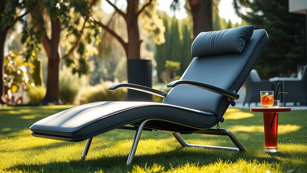 Choosing the right zero gravity chair means paying close attention to its comfort and adjustability features. I look for models with adjustable recline angles, ideally from 90° to 170°, so I can find my perfect position. Lockable positions are a must, ensuring the chair stays securely at my preferred angle without slipping. Padded headrests and contoured armrests that can be repositioned or adjusted provide personalized support, making long lounging sessions more comfortable. I also prefer chairs with multiple reclining options or smooth, multi-angle mechanisms for seamless posture changes. Additionally, ergonomic features like lumbar support or adjustable cushions are essential for added comfort. These options allow me to customize my experience and truly relax in my zero gravity chair.