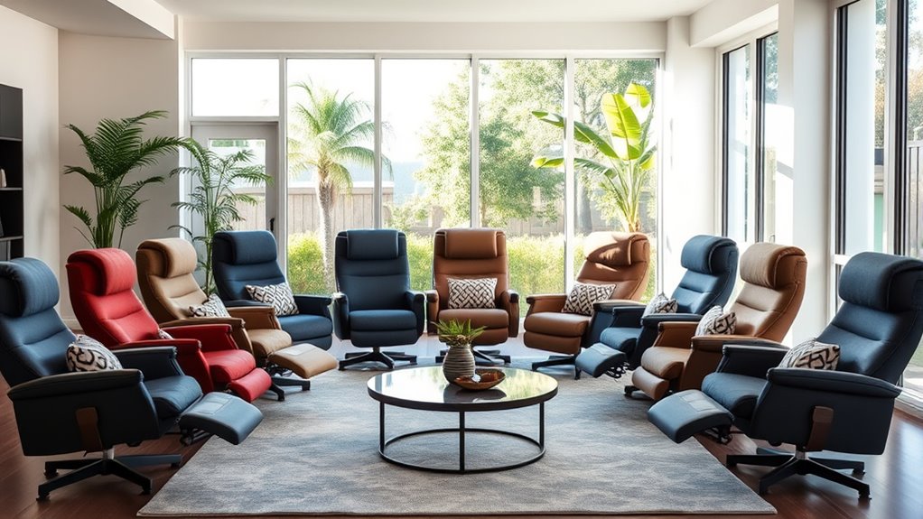 Choosing the right adjustable recline angles for your zero gravity lift chair is essential for achieving maximum comfort. Typically, these chairs allow you to adjust angles between 105° and 170°, letting you find the perfect position for your needs. I love that I can modify the recline to evenly distribute my body weight, which reduces pressure on my spine and hips. With precise control, I can smoothly shift from an upright position to zero gravity or fully reclined. Some chairs even have preset modes for lounging or watching TV, making adjustments quick and easy. These adjustable angles not only enhance relaxation but also improve circulation and spinal alignment, tailored just for me.