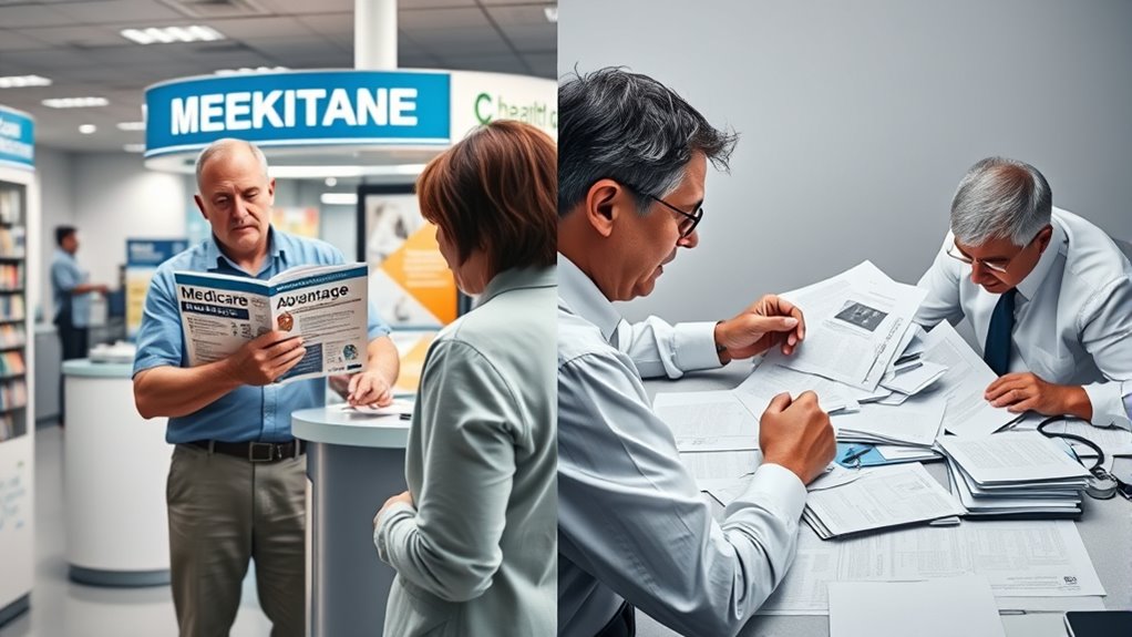 When comparing out-of-pocket costs and coverage limits, understanding how each plan type manages expenses is essential. With a premium comparison, Medicare Advantage plans often have lower monthly premiums but may include copayments and coinsurance that add up over time. Medigap policies, on the other hand, typically have higher premiums but cover many out-of-pocket costs, offering more predictable expenses. Coverage limits also differ: Medicare Advantage plans may have maximum out-of-pocket caps, protecting you from catastrophic costs, while Medigap plans generally don’t have such limits. Additionally, provider networks vary markedly. Medicare Advantage plans often restrict you to specific providers, whereas Medigap allows you to see any doctor that accepts Medicare, giving you more flexibility and control over your healthcare choices. Notably, Medicare plan options can be complex, so careful comparison is advised to avoid unexpected costs.